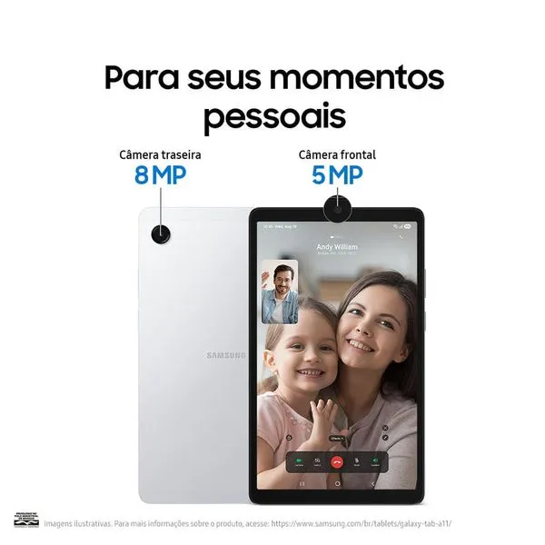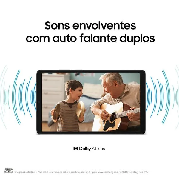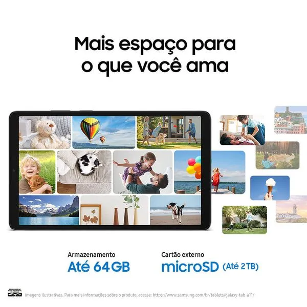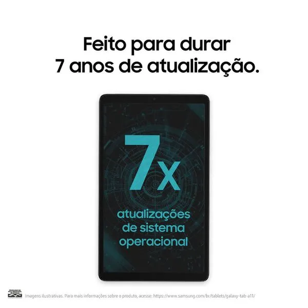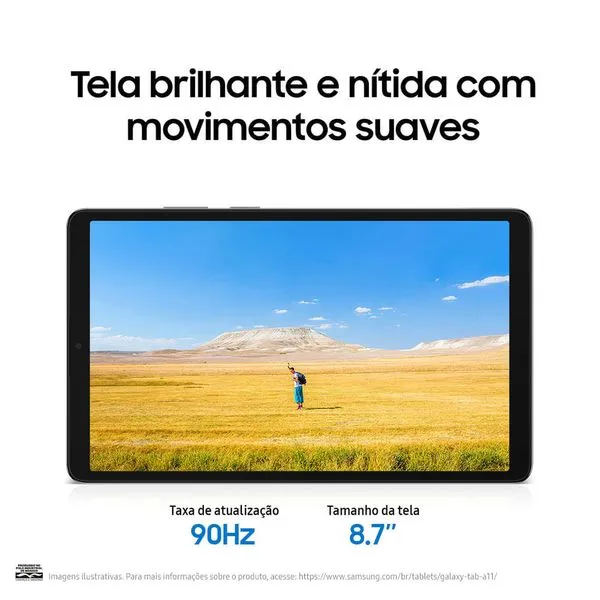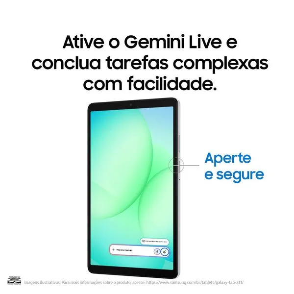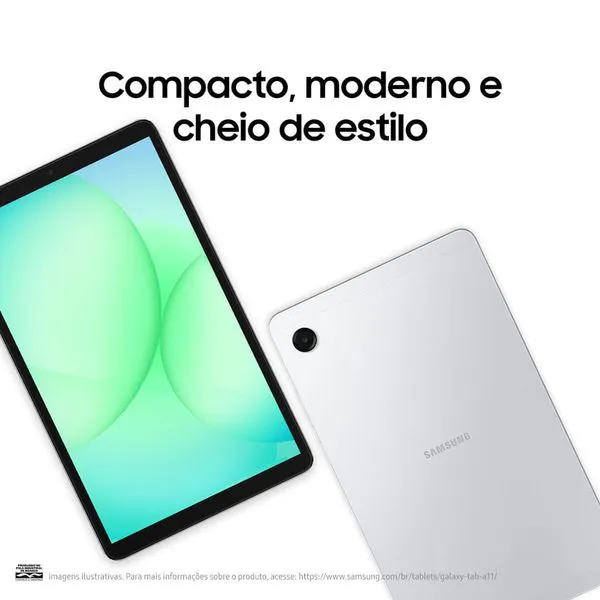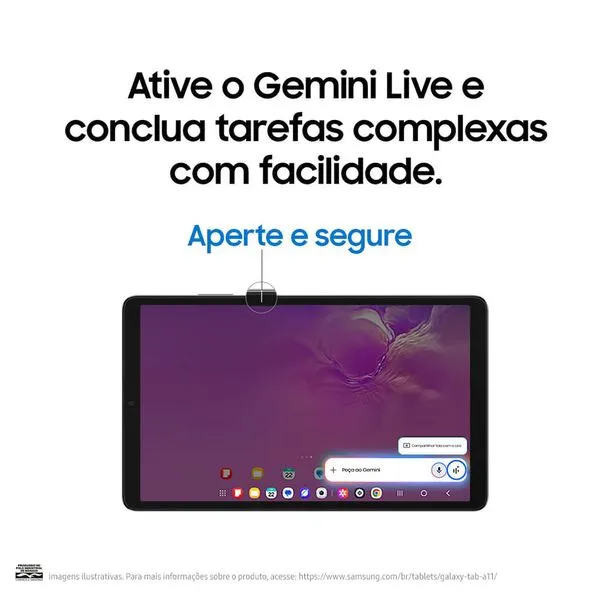 Features Principais Estude de forma mais inteligente e eficiente com o 'Assistente Matemático', que ajuda você da matemática básica ao cálculo. Basta digitar ou falar naturalmente com o Gemini para concluir suas tarefas com agilidade. Fino e leve permitindo que você segure seu tablet com mais conforto. Um processador mais potente para fazer com que cada tarefa seja executada de forma mais rápida e suave. Aproveite ao máximo com um alto-falante duplo e taxa de atualização de 90 Hz para uma visualização suave e envolvente. Desfrute de vídeo chamadas mais nítidas e naturais com sua família e amigos usando a nova câmera frontal de 5MP. Não entre em pânico mesmo se não conseguir encontrar seu dispositivo. O Samsung Find permite que você localize seu dispositivo facilmente.DIMENSÕES Dimensões do Aparelho (LxAxC - mm) 211,0 x 124,7 x 8,0 Peso do Aparelho (g) 335gFORMATO E INTERFACE Formato do Aparelho Tablet Interface com o Usuário Touch ScreenSISTEMA OPERACIONAL Sistema Operacional + Versão Android / 15.0 Plataforma 64bit Loja de Aplicativos Play Store / Galaxy AppsPROCESSADOR Modelo do Processador Helio G99 Processo de fabricação (nm) 6 Número de Núcleos Octa-Core Velocidade do Processador 2.2GHz, 2GHz GPU ARM / Mali G57 MC2 Velocidade da GPU 1GHzCONECTIVIDADE Bluetooth Bluetooth v5.3 Browser Google / Chrome; Samsung / Samsung Internet Geração do WiFi Wi-Fi 5 Versão do Wi-Fi 802.11a/b/g/n/ac 2.4GHz+5GHz, VHT80 Roteador Wi-Fi Não NFC Não SAMSUNG Pay Não 2 Chips N/A Tipo de SIM N/A USB versão USB 2.0 USB Conector USB Type-C SENSORES Tipos de Sensores Acelerômetro, Sensor Geomagnético, Sensor de Luz Leitor Biométrico N/A DISPLAY Tecnologia TFT Tamanho do Display 8.7" / 220.5mm Taxa de Atualização da Tela 90 Hz Número de Pixels 1340 x 800 (WXGA+) Nível de Brilho 179 Quantidade de Cores 16M Vidro Reforçado Não CÂMERA TRASEIRA Resolução 8.0 MP Abertura do Diafragma F2.0 Campo de Visão (FOV) 77 Zoom Zoom Digital de até 4x Estabilizador Óptico de Imagem (OIS) Não Foco Automático (AF) Sim Flash Não CÂMERA FRONTAL Resolução 5.0 MP Abertura do Diafragma F2.2 Campo de Visão (FOV) 77 Zoom Não Estabilizador Óptico de Imagem (OIS) Não Foco Automático (AF) Não GPS GPS GPS,Glonass,Beidou,Galileo,QZSS MEMÓRIA Memória RAM 4 / GB Memória Interna total compartilhada 64 / GB Cartão de Memória MicroSD (Até 2TB) B2B Solutions EAS IT Policy N/A MDM Android / 6.11 ODE (On Device Encryption) Sim KNOX Android / 3.11 BATERIA & CARREGAMENTO Capacidade da Bateria (mAh) 5100 / mAh Tipo de Bateria Íons de Lítio - não removívelACESSÓRIOS INBOX Tablet, Pino ejetor para bandeja de cartão MicroSD, Cabo USB-C, Carregador de parede (15W), Guia Rápido.* Memória interna compartilhada com o sistema operacional e aplicativos pré embarcados.