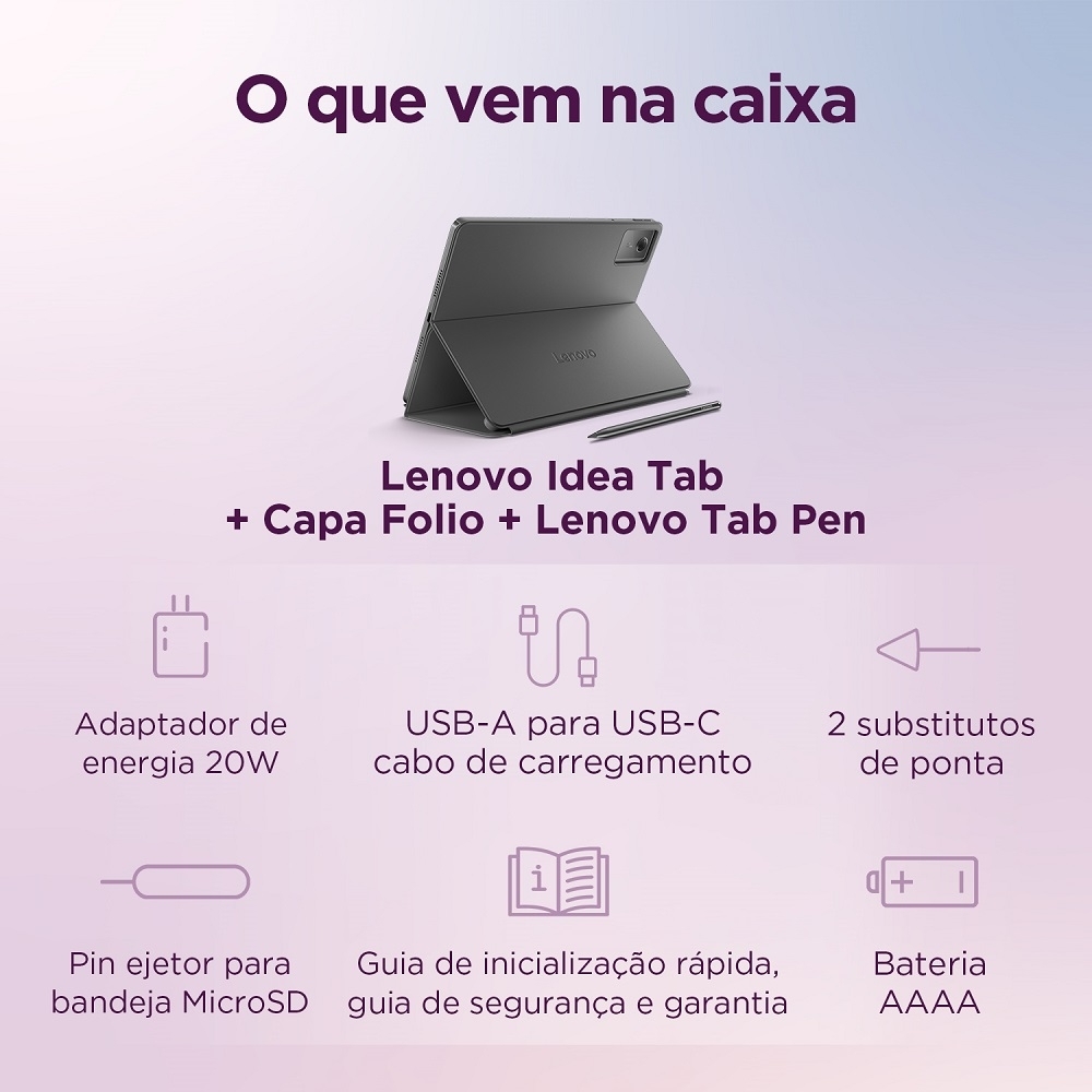 Descrição:Facilite os estudos e mantenha o foco com o Lenovo Idea Tab, seu companheiro de estudos com inteligência artificial.A tela de 11" com resolução 2.5K e taxa de atualização de 90Hz, junto aos quatro alto-falantes Dolby Atmos, oferecem imagens nítidas e som imersivo para aprendizado, aulas e diversão.Abra o aplicativo Notepad e use o Lenovo AI Notes para continuar escrevendo quando estiver sem ideias, reformular anotações confusas ou resumir conteúdos longos rapidamente.Com o processador MediaTek D6300, que oferece até 70% mais desempenho*, a multitarefa se torna suave e sem esforço.Principais recursos:Tela vívida e fluida: 11", 2.5K (2560 x 1600) LCD, 500 nits, taxa de atualização de 90HzDesempenho aprimorado: MediaTek D6300 com 70% mais potência* que a geração anteriorAprendizado inteligente: Lenovo AI Notes no app Notepad com reformulação de texto e resumos via IA, tudo mais fluido com a Lenovo Tab PenÁudio cinematográfico: quatro alto-falantes com ajuste Dolby AtmosAnotações eficientes: Lenovo Tab Pen com 40% menos latência em relação à geração anteriorColaboração entre dispositivos: conecte seu PC e celular com o Lenovo Smart Connect 2.0Sempre atualizado: lançado com Android™ 15, com promessa de 2 atualizações de sistema e 4 anos de atualizações de segurança.Especificações:Nome do Produto : Lenovo Idea TabNome do Modelo: Idea TabPart Number: ZAFR0856BREAN: 0198158677103UPC: 198158677103Cor: CinzaCategoria: TabletProcessador: MediaTek Dimensity 6300 (Cores / Threads) Octa-core 2x A76 + 6x A55 (Clock) A76@2.4 GHz, A55@2.0 GHzMemória RAM: 8GBDetalhe memória RAM: 8GB LPDDR4xArmazenamento: 128GB UFS 2.2Máxima expansão do armazenamento: 1x MicroSD Card até 2TB (exFAT)Chipset: MediaTek SoC (System on Chip) platformPlaca de vídeo: Integrated Arm Mali-G57 MC2 GPUSistema Operacional [Pré-Instalado]: Android 15Tela: 11" 2.5K (2560x1600), 90Hz, WVAResolução de Tela: 2.5K (2560x1600)Formato de Tela: 16:10Tipo de Tela: MultitouchBrilho de Tela: 500 nits Outros aspectos da tela: Certificação TÜV Rheinland® Flicker Free e TÜV Rheinland® Low Blue Light (Hardware Solution)Wireless: Wi-Fi® 5, 802.11ac 1x1 Wi-Fi® + Bluetooth® 5.2Camera Frontal: 5MP com desbloqueio facialTraseira: 8MP com foco automáticoMicrofone: MonoBluetooth: Bluetooth® 5.2Audio (alto falantes): 4 saídas de som, 1W x 4, otimizadas com Dolby AtmosAudio (porta combo para headset/headphone): 1USB (2.0): 1 USB-C (Tranferência de dados e alimentação)Leitor de Cartões: MicroSDBateria: 7040mAhAdaptador AC: 10V / 2.0ADimensões produto aprox. Largura: 254.59 mmDimensões produto aprox. Profundidade: 166.15 mmDimensões produto aprox. Altura: 6.99 mmPeso produto aprox.: 480 gDimensões embalagem aprox. Largura: 202 mmDimensões embalagem aprox. Profundidade: 273 mmDimensões embalagem aprox. Altura: 61 mmPeso embalagem aprox.: 1,330 kgConteúdo da Embalagem:01 Tablet Lenovo TB336FU01 Caneta Lenovo Tab Pen01 Lenovo Idea Tab Case01 kit de manuais01 Cabo de sincronização01 Carregador01 Ferramente de remoção